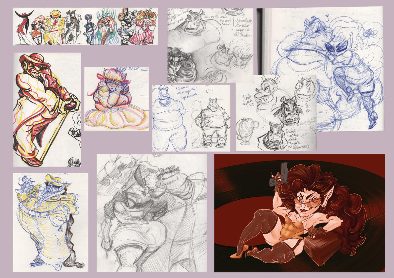 3 personnages, leurs concept art et storyboards