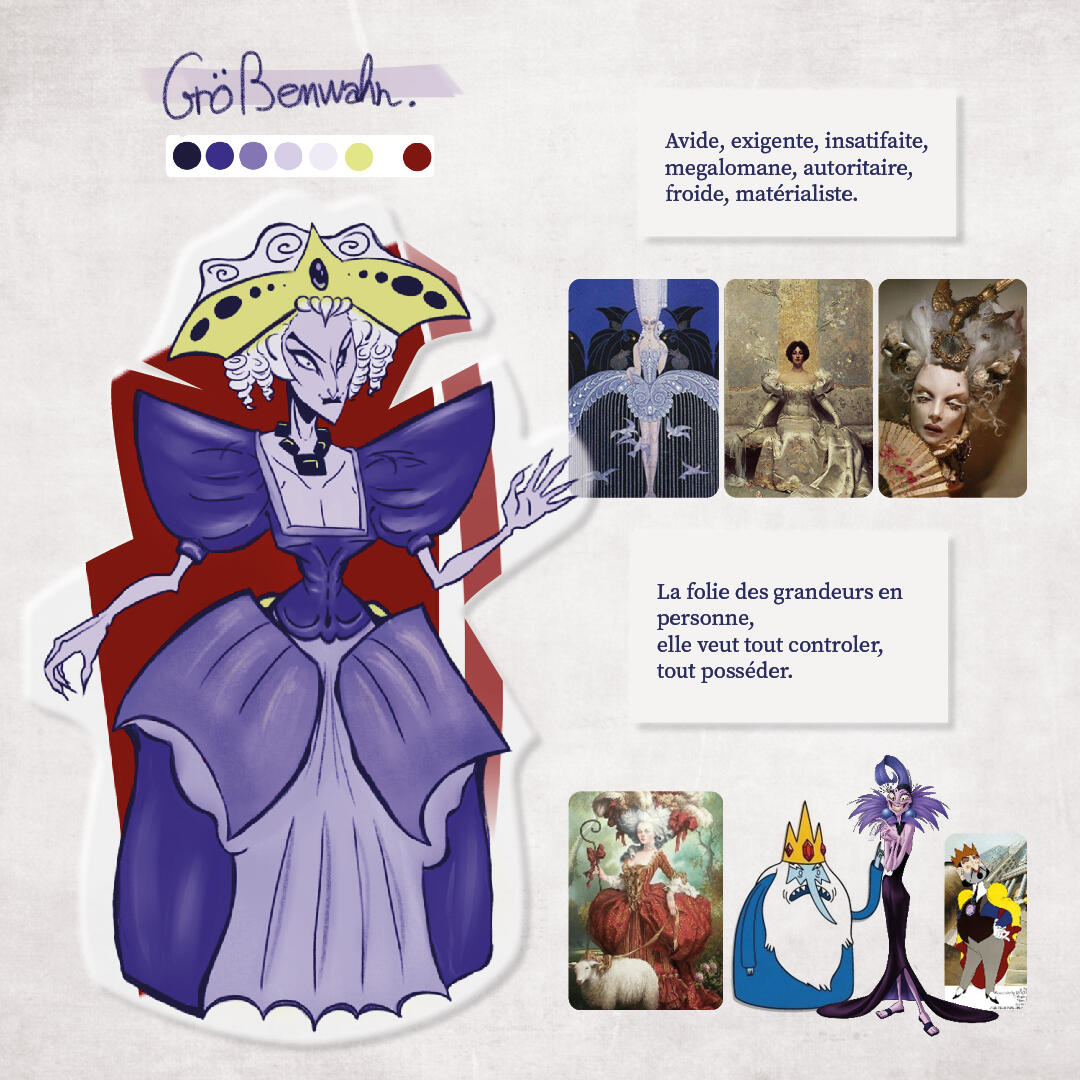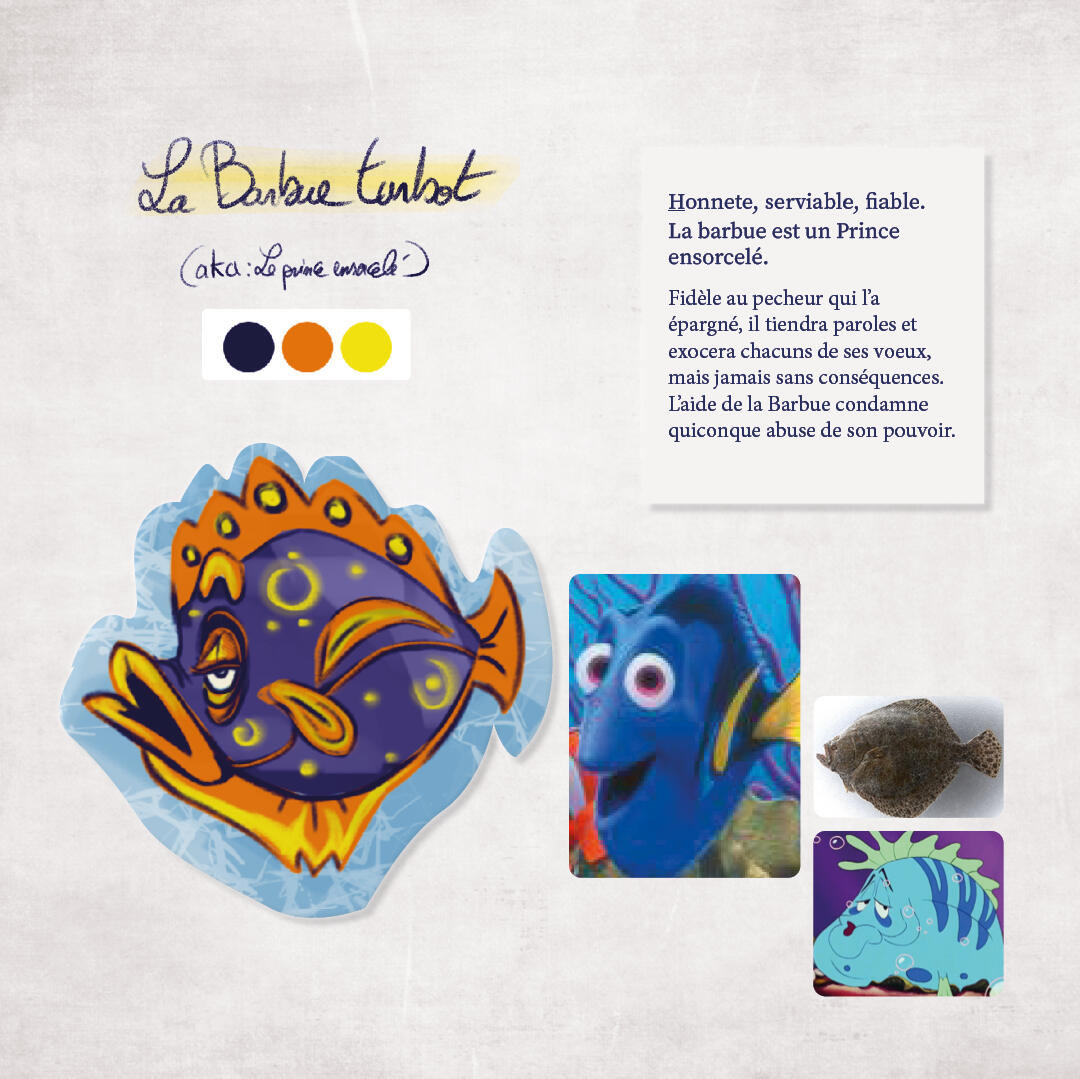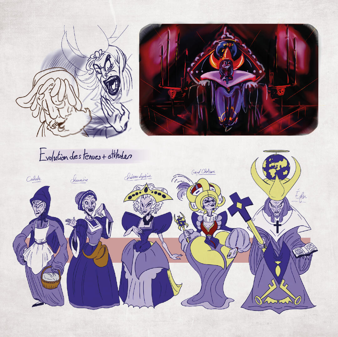 3 personnages, leurs concept art et storyboards