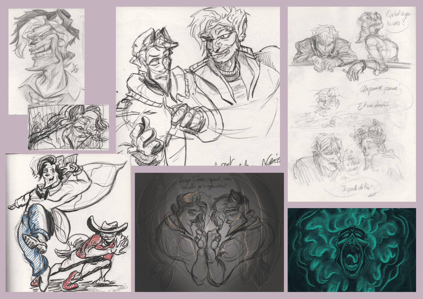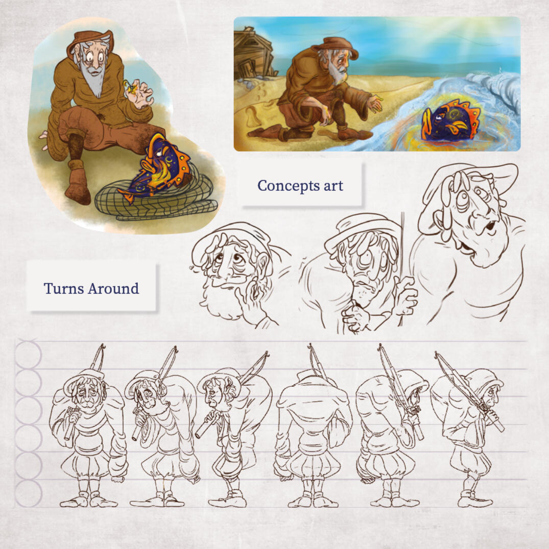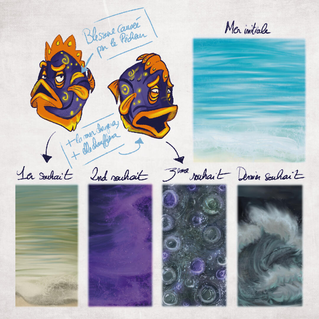 "Le pêcheur, le poisson et Größenwahn"Logiciels: TVPaint, Krita, After Effects, Premiere pro, Blender (aide au décors et storyboard), IndesignTemps: + de 6 moisPour plus de détails ne pas hésiter à jeter un œil au produit fini et au dossier de production qui contient en détails toutes les étapes de la post-production jusqu’à la production